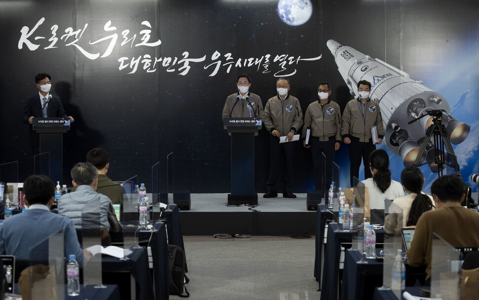 하지만 발사 후 지상에서의 데이터 분석 등이 이뤄진 1시간10여분 만의 문재인 대통령 메시지를 통해 위성모사체 궤도 안착이 이뤄지지 않았다는 사실이 발표되며 지켜보는 이들의 희비가 뒤바뀌었다. 임혜숙 과학기술정보통신부 장관과 이상률 한국항공우주연구원(항우연) 원장, 고정환 항우연 한국형발사체개발사업본부장 등 질의응답에 나선 연구진은 “모든 것들이 정확하게 맞았는데 연소 시간이 짧아 궤도에 못 들어간 것이 아쉽다”며 브리핑 중 일부 눈물을 보이기도 했다.