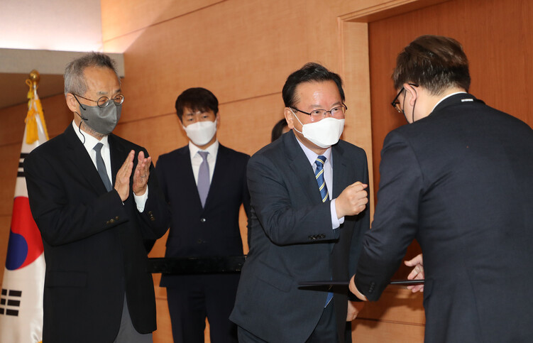 13일 정부서울청사 별관에서 일상회복위 첫 회의에서 공동위원장인 김부겸 국무총리와 최재천 교수가 위원들에게 임명장을 수여하고 있다.