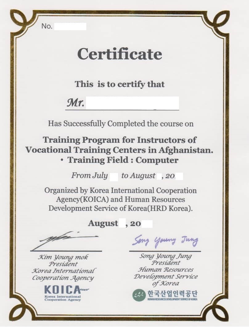 아프간인 ㅎ씨가 코이카와 한국산업인력공단 쪽으로부터 받은 직업훈련 교사 연수 수료증. ㅎ씨 제공