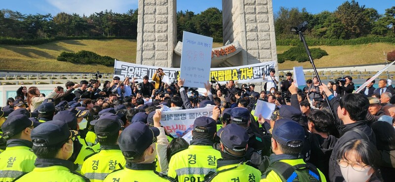 묘역 입구에선 참배 반대 집회