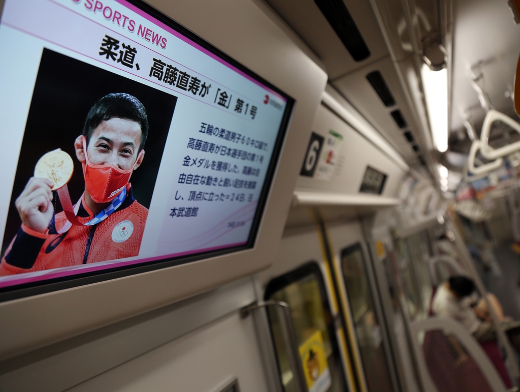 *도쿄올림픽 일본 금메달 '1호' 다카토 = 24일 오후 일본 도쿄도(東京都)에서 운행하는 지하철 전동차 내에 설치된 모니터에 도쿄올림픽 유도 남자 60㎏급에 출전한 다카토 나오히사(高藤直壽)가 일본 선수로는 이번에 첫 금메달을 획득했다는 뉴스가 나오고 있다.