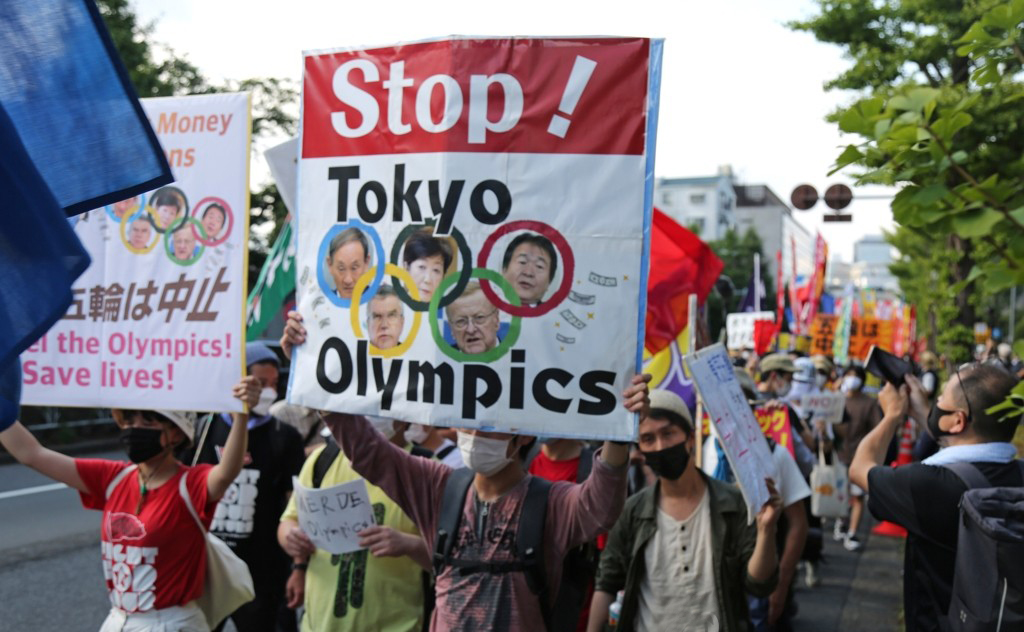 '도쿄올림픽 개최 반대'= 도쿄올림픽 개막식이 열리는 23일 오후 일본 도쿄 시부야구에서 올림픽에 반대하는 시민들이 시위하고 있다.