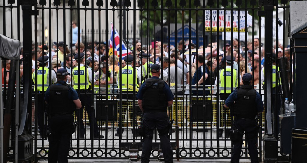 *보리스 존슨 영국 총리가 사회적 거리두기 전면해제 시점을 늦추겠다고 발표한 14일(현지시간) 봉쇄에 반대하는 시위대가 다우닝가 관저 인근에서 시위를 벌이고 있다. [EPA=연합뉴스]
