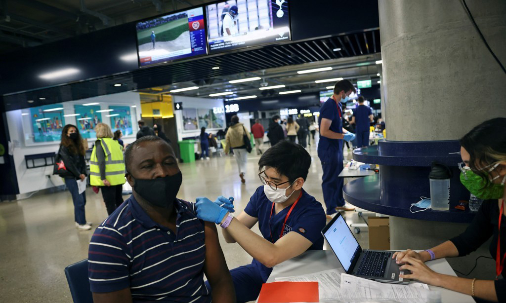 *영국 런던의 토트넘 홋스퍼 경기장에서 20일(현지시간) 화이자-바이오엔테크 신종 코로나바이러스 감염증(코로나19) 백신 접종이 이뤄지고 있다. [로이터=연합뉴스]