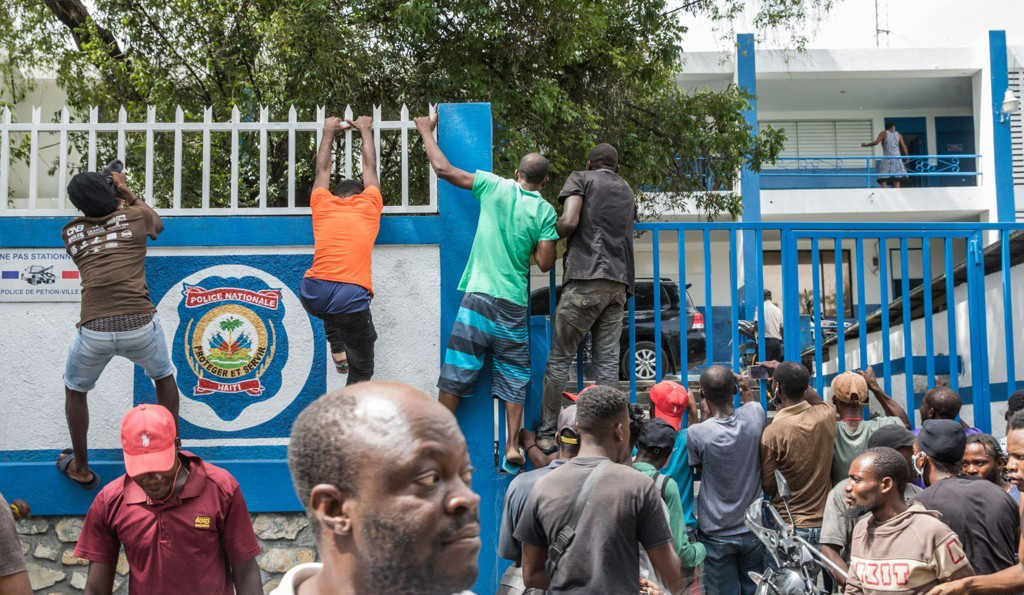 *모이즈 대통령 암살 용의자들이 구금된 경찰서밖에 모여든 시민들 [AFP=연합뉴스]