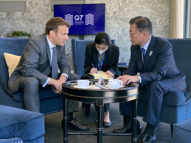 G7 정상회의 참석차 영국을 방문 중인 문재인 대통령이 13일 오전(현지시간) 영국 콘월 카리스베이 정상회담 라운지에서 마크롱 프랑스 대통령과 약식회담을 하고 있다.