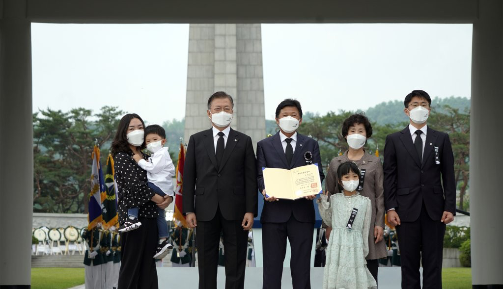 문 대통령, 국가유공자 가족과 함께: 문재인 대통령이 6일 오전 서울시 동작구 국립서울현충원에서 열린 제66회 현충일 추념식에 참석, 6.25 참전 고 조창식 순직군경 조카 조철주 씨에게 국가유공자증서를 수여한 뒤 기념촬영을 하고 있다.