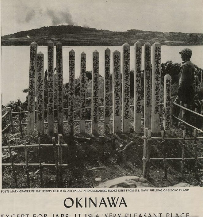 1945년 5월 28일 자 미국 잡지 '라이프(Life)'에 실린 오키나와의 무덤 묘표 사진. 오른쪽에서 각각 2번째와 4번째 묘표에 '金山萬斗'(김산만두)와 '明村長模'(명촌장모)라는 적힌 것은 군속으로 동원된 한반도 출신 김만두 씨와 명장모 씨인 것으로 파악됐다. [동아시아 시민네트워크 제공]