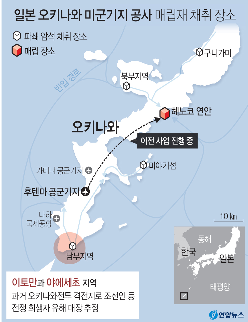 7일 연합뉴스가 계획서의 세부 내용을 확인해보니 2차 대전 말기에 벌어진 오키나와 전투 현장인 오키나와 본섬 남부 이토만(絲滿)시와 야에세초(八重瀨町)가 매립용 토사 등을 채취할 장소로 기재돼 있었다.