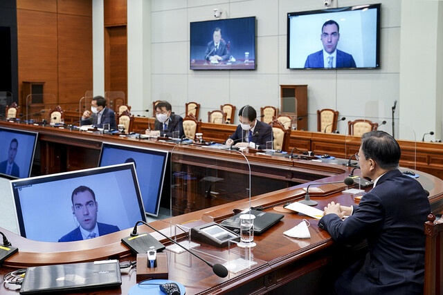 문 대통령이 지난 9일 <타임>과 화상으로 인터뷰를 진행하고 있다. 청와대 제공