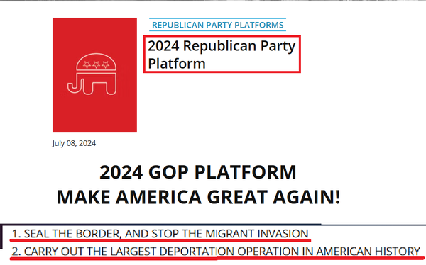 그러나 트럼프 정부는 이민정책을 금지·감시·처벌의 차원으로 접근한다. 지난해 공화당의 선거공약집은 정부의 정책 1, 2순위가 각각 ‘국경봉쇄와 이주민 침략(migrant invasion) 저지’. ‘사상 최대의 (이민) 추방작전 집행’이라고 대놓고 적시했다(사진 3 참조). 그리고 트럼프는 취임하자마자 관련 행정명령을 쏟아냈다. 이민 저지, 불법이민 근절, 불법 체류자 체포, 수감, 추방에 힘을 쏟는 형벌 중심의 반이민 노선을 명확히 한 것이다. 그리고 이젠 군대까지 포함한 공권력을 총동원, 단속에 나서고 있다.