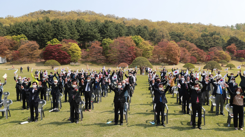 충북 청남대에서 열린 임시정부 102주년 기념식 참석자들의 만세삼창