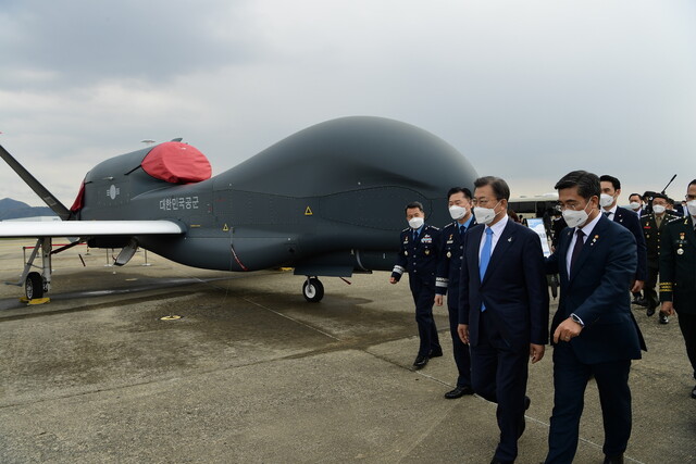문재인 대통령이 9일 경남 사천시 한국항공우주산업(KAI) 고정익동에서 한국형전투기 보라매(KF-21) 시제기 출고식을 마치고 우리 군이 보유한 주요 무인체계 장비를 시찰하고 있다.