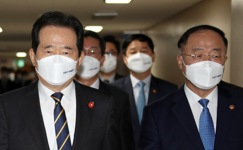 정세균 국무총리(왼쪽)가 29일 반부패정책협의회 결과 브리핑을 위해 홍남기 부총리 겸 기획재정부 장관 등 장관들과 함께 정부서울청사 브리핑실로 이동하고 있다. 참석자들 모두 ‘부동산 부패청산'이라는 글이 쓰여 있는 마스크를 착용하고 있다. 연합뉴스.