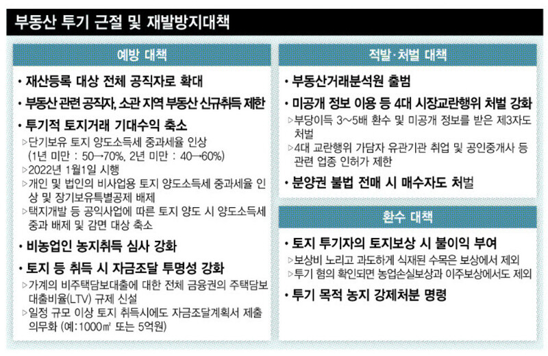 정부는 예방·적발·처벌·환수 등 4개 영역별로 나눠 총 20개의 세부 대책을 공개했다. 예방 대책으로 양도소득세율을 1년 미만 보유 토지는 50%에서 70%로, 2년 미만은 40%에서 60%로 인상하기로 했다. 정부는 소득세법·법인세법 시행령을 개정해 내년 1월부터 시행할 계획이다. 비사업용 토지의 경우 양도세 중과세율을 10%포인트에서 20%포인트로 올리고, 장기보유특별공제(최대 30%) 적용도 제외하기로 했다.