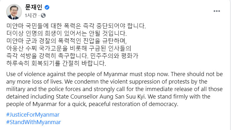 문 대통령은 이날 소셜네트워크서비스(SNS)에 글을 올려 “미얀마 국민들에 대한 폭력은 즉각 중단돼야 한다. 더 이상 인명의 희생이 있어서는 안 될 것”이라고 밝혔다. 이어 문 대통령은 “민주주의와 평화가 하루속히 회복되기를 간절히 바란다”고 덧붙였다. 문 대통령은 영어로 같은 내용의 메시지를 올린 데 이어 해시태그를 달아 ‘저스티스 포 미얀마’(#JusticeForMyanmar), ‘스탠드 위드 미얀마’(#standwithmyanmar)라고 적었다.