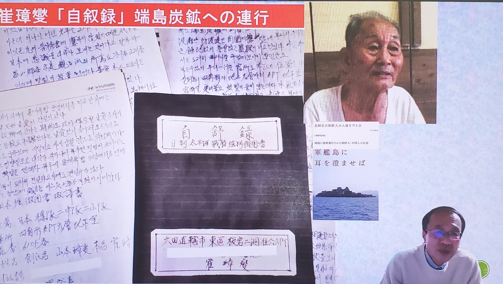 강연하는 다케우치 야스토: 일제 강점기 역사 연구자인 다케우치 야스토(竹內康人, 화면 오른쪽 아래) 씨가 13일 오후 온라인 회의 시스템 '줌'을 이용한 강연회에서 일제 강점기 하시마(端島, 일명 '군함도')에 동원돼 강제 노역한 한국인 징용 피해자 등에 관해 설명하고 있다. 화면에 강제 노역 피해자인 최장섭(2018년 별세) 씨의 사진과 그와 관련된 자료가 함께 제시되고 있다. [줌 화면 재촬영]