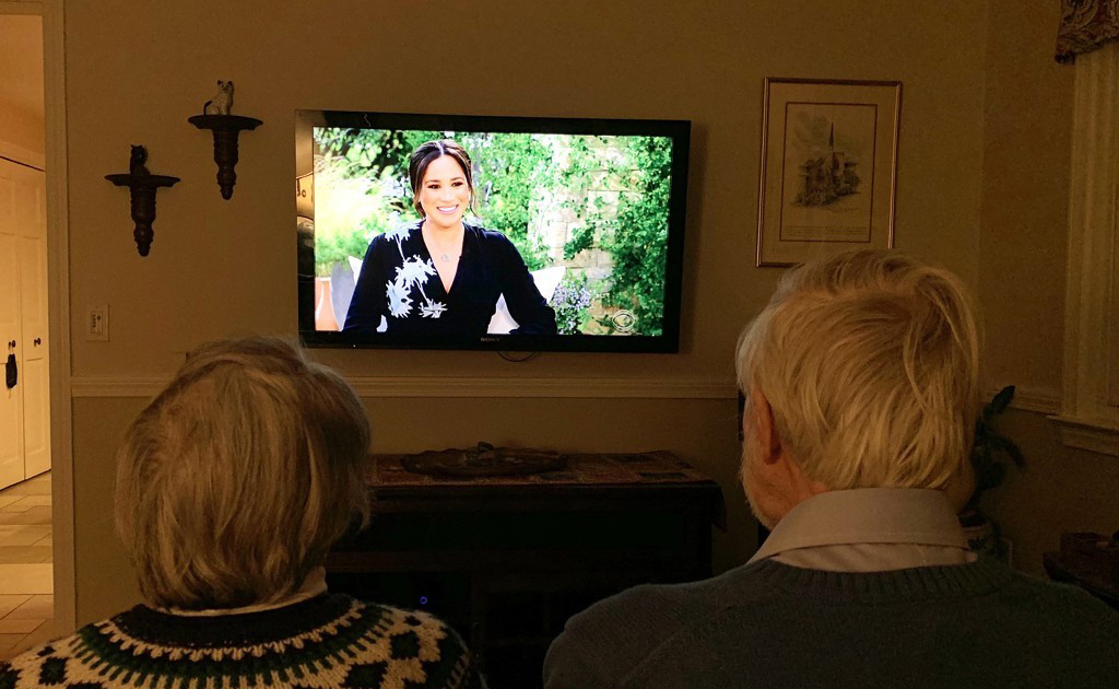 7일 미국에서 방영된 영국 해리 왕자 부부 인터뷰를 지켜보는 사람들. [EPA=연합뉴스]
