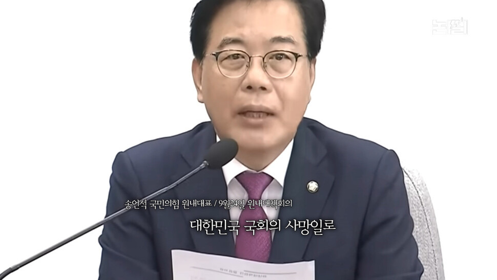 “이대로 청문회가 열리게 된다면 2025년 9월30일은 대한민국 삼권분립 사망일, 대한민국 국회의 사망일로 역사에 기록될 것입니다.”(송언석 국민의힘 원내대표, 23일 원내대책회의)