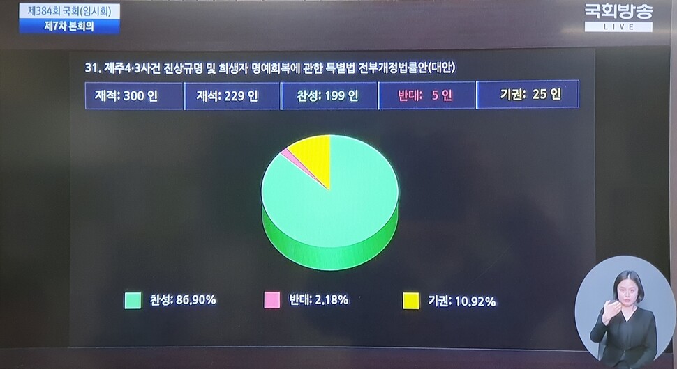 제주4·3특별법 전부 개정안이 26일 오후 국회 제384회 임시회 제7차 본회의에서 찬성 199명, 반대 5명, 기권 25명으로 통과됐다.