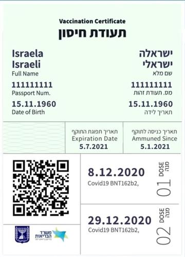 이스라엘의 코로나19 백신 접종 증명서 '그린 패스' 견본 [이스라엘 보건부 제공=연합뉴스]