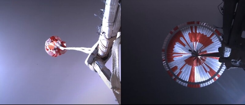NASA는 또 탐사 로버가 낙하산을 펼치고 착륙 지점인 '예제로 크레이터'(Jezero Crater)로 빠르게 하강하는 사진도 공개했다. 이 장면은 700㎞ 떨어진 화성 궤도 탐사선의 고해상도 카메라가 잡아냈다.