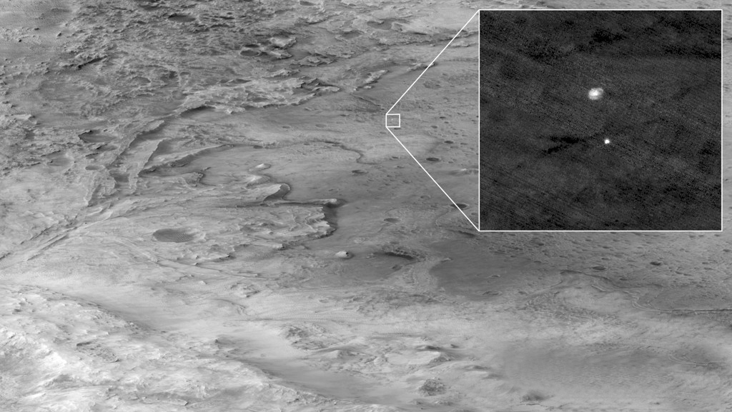 화성 정찰궤도선(MRO)에서 촬영한 퍼시비런스 착륙지역. 노란색 동그라미 안의 물체는 왼쪽부터 하강선, 퍼시비런스, 열 차폐막이다. 나사 제공