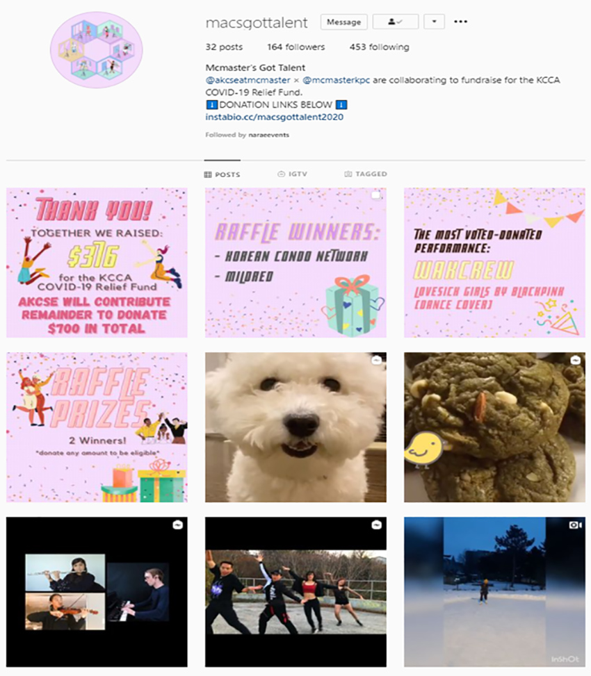 이들 맥매스터 한인 대학생들은 지난해 12월3일 이벤트를 통한 모금과 기부계획을 세우고 12월13일부터 지난 2월7일까지 ‘Mac’s Got Talent‘ (맥마스터 장기자랑) 유튜브 및 인스타그램 행사를 열어 공식 채널에 참가자들이 장기자랑을 업로드 한 후 일반인들의 인기투표를 받으며 1표당 1달러씩을 후원 받는 이벤트를 진행해 참가자 가운데 대상($100)을 시상하고 래플 추첨을 통해 토론토 한인회가 마련한 다양한 상품을 주는 방식으로 온라인 행사를 열었다. 학생들은 이렇게 해서 모은 7백 달러 모두를 토론토한인회에 전달해 ’안녕캠페인-소외계층 지원 사업‘을 후원했다.