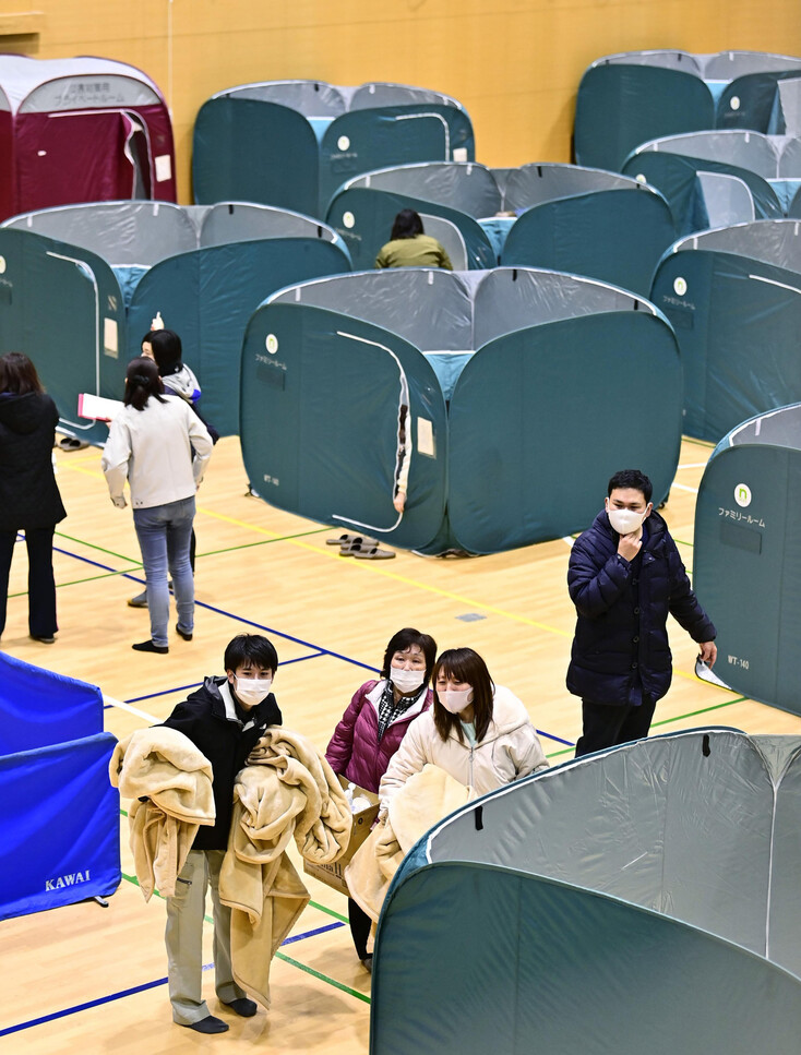 14일 일본 도호쿠 지방 후쿠시마현 소마시 한 체육관에 전날 발생한 규모 7.3의 지진을 피해 대피한 사람들이 모여 있다. 코로나19 확산을 우려해 약 2미터 간격으로 텐트가 세워져 있다. 소마/AP 연합뉴스