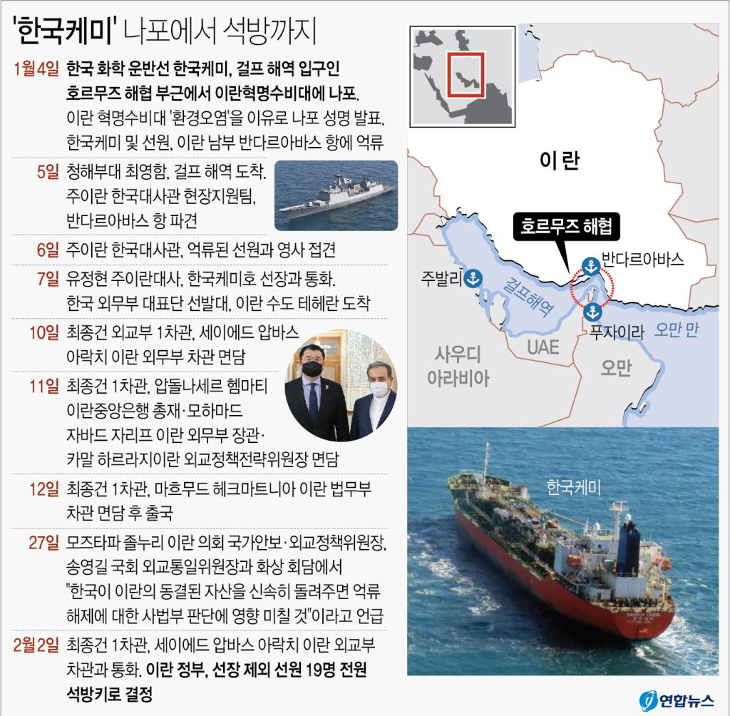 | 이란, 나포 한달 만에 한국 유조선 케미호 선원 19명 석방 (0) | 2021.02.03 |