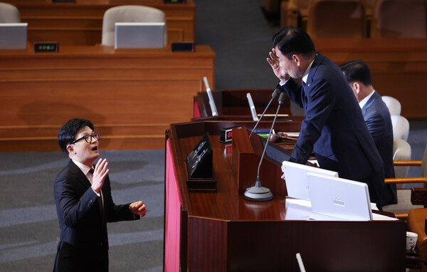 ▲'통일교 금품 수수 의혹'을 받는 권성동 국민의힘 의원이 지난달 21일 서울 여의도 국회에서 열린 의원총회에 참석해 윤한홍 의원과 대화하고 있다. ⓒ 남소연