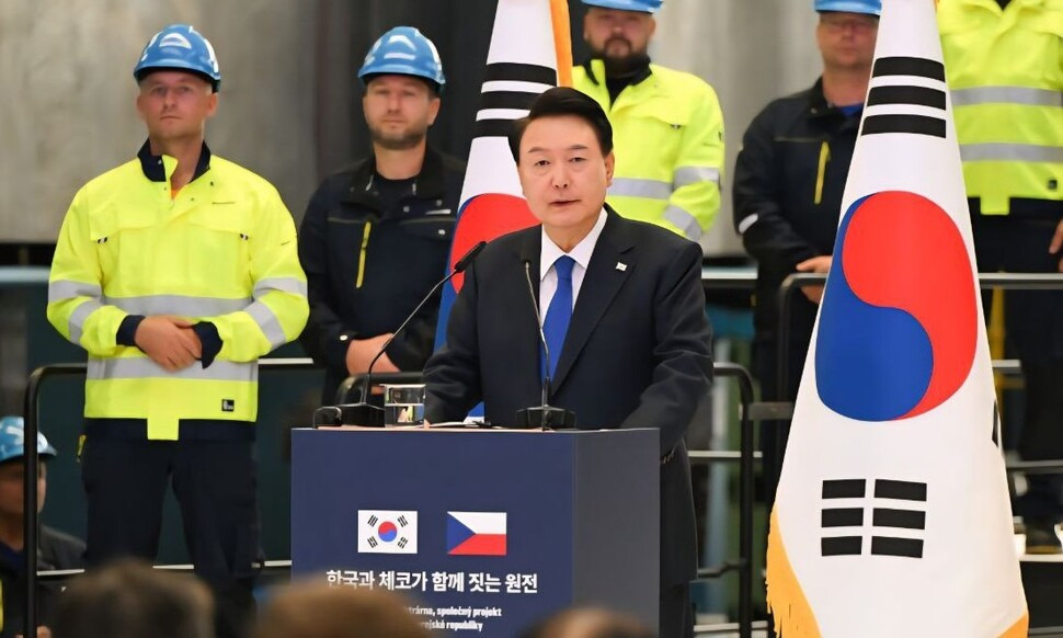 윤석열 전 대통령이 지난해 9월 체코 플젠시에 있는 두산스코다파워 공장에 방문에 현지 관계자들에게 인사말을 하고 있다. 대통령실 제공