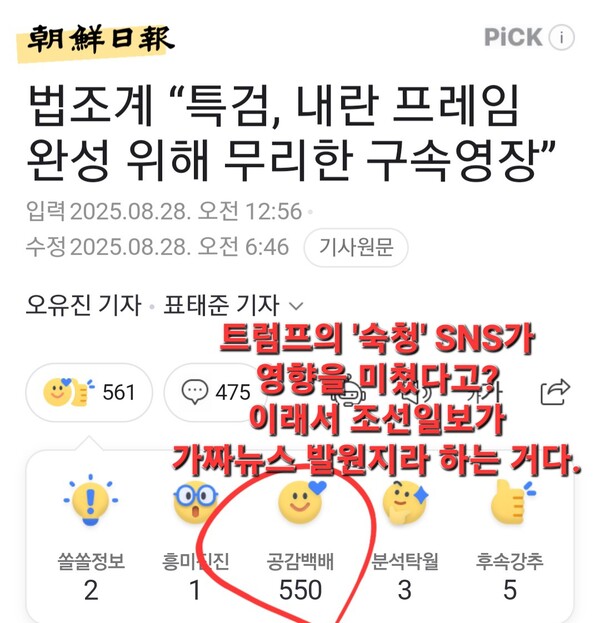 한덕수 구속영장 기각을 전하는 조선일보의 왜곡은 특검에 음모 프레임을 씌우는 게 전부가 아니다. 트럼프 미국 대통령이 한덕수 영장 기각에 영향을 주기라도 한 것처럼 호도한다. 법조계에서는 트럼프 대통령이 이재명 대통령과 정상회담을 앞두고 SNS에 올린 ‘한국에선 지금 숙청이 일어나고 있는 것처럼 보인다’는 글이 판사에게 영향을 미친 것 아니냐는 말도 나왔단다. 그 말인즉, 한덕수 구속영장을 기각한 판사는 트럼프 대통령이 SNS에 올린 ‘숙청’ 글에 겁을 먹고 알아서 기었다는 것인데, 그게 상식적으로 말이 되는가. 설령 그런 정신 나간 주장을 하는 법조인이 있다 하더라도, 그것이 법조계의 대표적이고 보편적인 의견이고 보도할 공익적 가치가 있는가.
