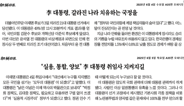 반민족 반민주 방씨조선일보가 애국자 코스프레를 이어가고 있다. ‘오늘 대통령 선거, 갈등에서 통합으로 넘어가길’(6월 3일), ‘이 대통령, 갈라진 나라 치유하는 국정을’(6월 4일), ‘"실용, 통합, 양보" 이 대통령 취임사 지켜지길’(6월 5일). 21대 대통령 선거 전후를 통한 3일 동안의 방씨조선일보 사설 제목이다.