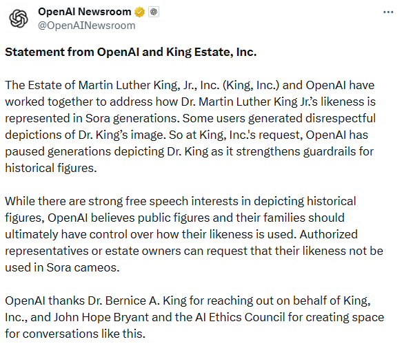 해외에서는 이미 AI를 통한 '위인 복원'의 폐해가 공론화됐다. 지난해 10월 오픈 AI는 마틴 루터 킹 목사의 이미지를 사용한 영상 생성이 악용돼 관련 생성 기능을 일시 중단했다. 오픈 AI는 "표현의 자유가 있지만 역사적 인물이나 유족은 그 초상을 어떻게 쓸지 통제할 권리가 있다"고 밝혔다.
