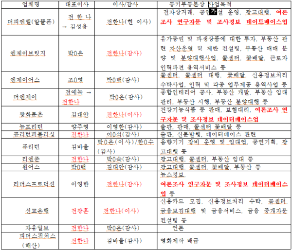 또 ㈜더피엔엘, ㈜광화문온, ㈜리더스프로덕션 등 3개 사업장의 등기부등본상 '여론조사 연구 자문 및 조사정보 데이터베이스업'을 사업목적으로 명시하고 있다.