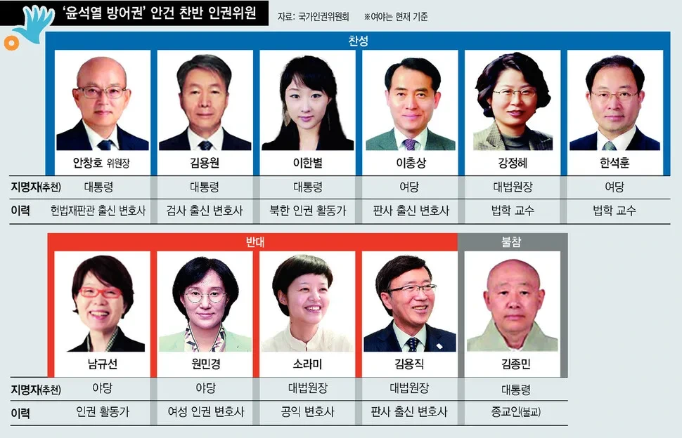 인권위는 10일 제2차 전원위원회를 열고 김용원 상임위원 등이 지난달 발의한 뒤 일부 수정한 '계엄 선포로 야기된 국가적 위기 극복 대책 권고의 건'을 상정해 재적 위원 11명 중 찬성 6명(안창호·강정혜·이충상·이한별·한석훈), 반대 4명(남규선·원민경·김용직·소라미)으로 통과시켰다. 의결된 사항은 ▲헌법재판소는 윤석열 대통령에 대한 탄핵심판 심리 시 형사소송에 준하는 엄격한 증거조사 실시 등 적법 절차 원칙을 준수할 것 ▲박성제 법무부 장관 등에 대한 탄핵소추의 남용 여부를 적극 검토해 남용이 인정되면 각하할 것 ▲서울중앙지법은 구속 피의자에 대해 형사법의 대원칙인 불구속 재판을 유념할 것 ▲수사기관은 불구속 수사 원칙을 유념할 것 등을 권고하는 내용이다.
