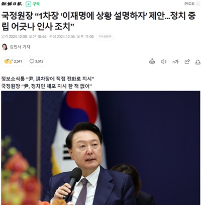 이 기사는 현재 <국정원장 "1차장 '이재명에 상황 설명하자' 제안… 정치 중립 어긋나 인사 조치"란 제목이 달려 있다. 수정 시각은 12월 6일 오후 11시 6분이다. 하지만 조선일보 X(옛 트위터)와 페이스북 계정 등에는 해당 기사를 소개하는 게시물이 여전히 존재한다. 매체 스스로 단독보도라고 했던 기사를 사실상 오보 취급하는 셈이다. 또한 홍 전 차장 진술은 큰 틀에서 달라진 게 없다. 오히려 매우 상세하다. 다음은 국회 회의록시스템에서 확인한 홍 전 차장의 '윤 대통령 체포 지시' 관련 발언이다.