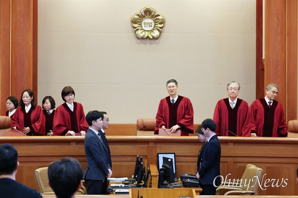 "그렇다면, 이 사건 심판청구는 이유 있으므로, 피청구인을 파면하여야 한다"는 것이 그의 최종 결론이었다. < 오마이 박소희 기자 >