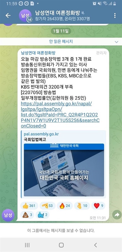 <오마이뉴스> 취재에 따르면, 신남성연대가 개설한 텔레그램 단체 채팅방에서는 지난 10일부터 국회 입법예고 사이트에서 민주당 법안에 대해 반대 의견을 개진하라는 운영자 공지가 잇따르고 있다. 이들의 주요 목표는 공영방송 이사 수를 늘리는 방송3법이다.
