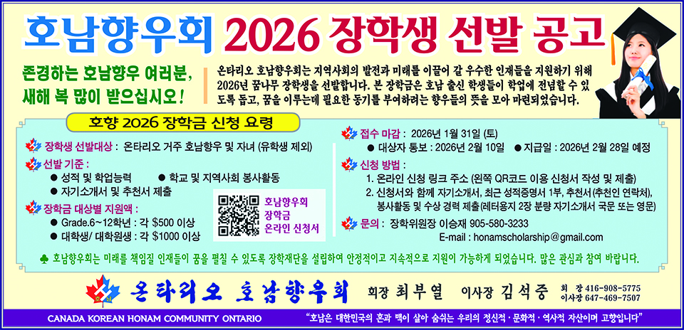 온타리오 호남향우회(회장 최부열)는 ‘지역사회 발전과 미래를 이끌어 갈 우수한 인재들을 지원하기 위한’ 2026 꿈나무 장학생을 1월31일(토)까지 신청받아 선발한다.