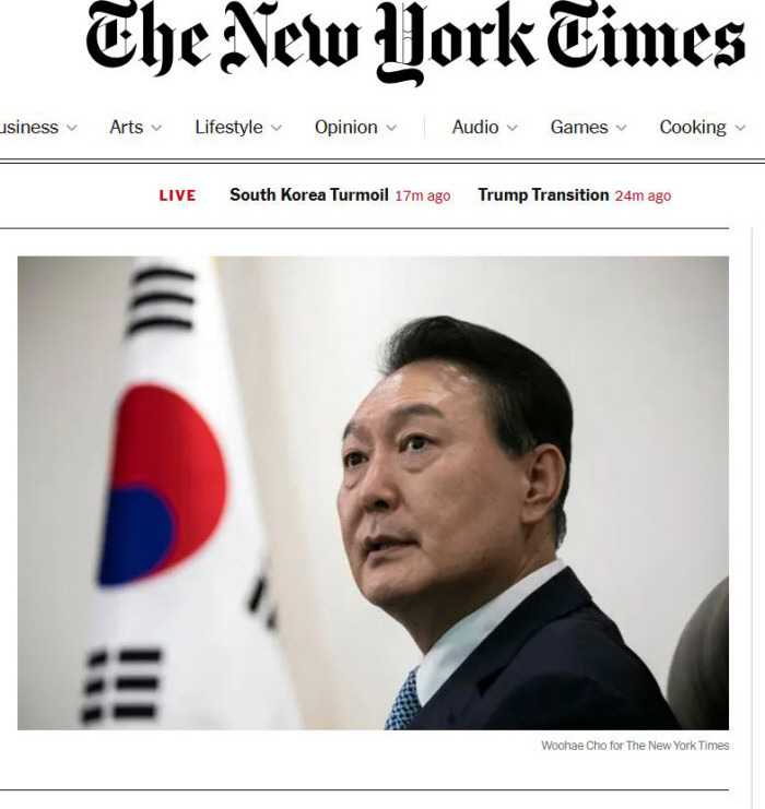 윤석열 대통령의 비상계엄 선포 소식을 긴급으로 전한 미 뉴욕타임스 메인 화면. 뉴욕타임스 홈페이지 캡처