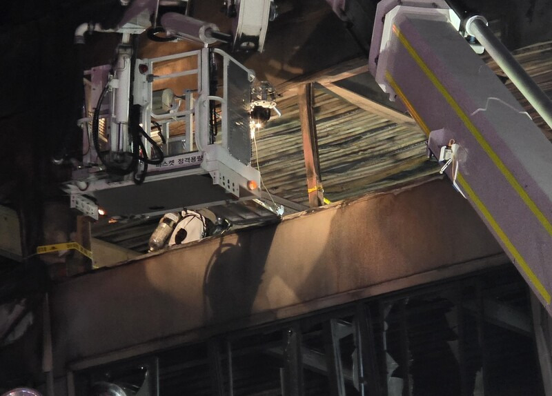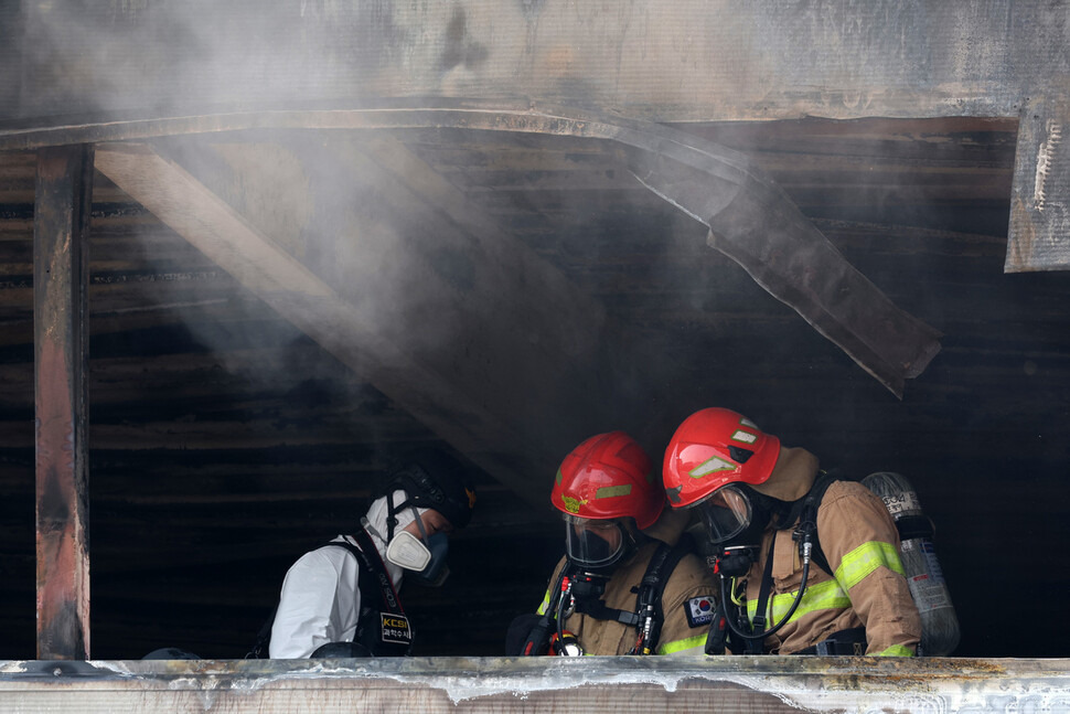 21일 오후 대형 화재가 발생했던 대전 대덕구 안전공업의 건물에서 소방 관계자가 인명 수색에 나서고 있다. 연합
