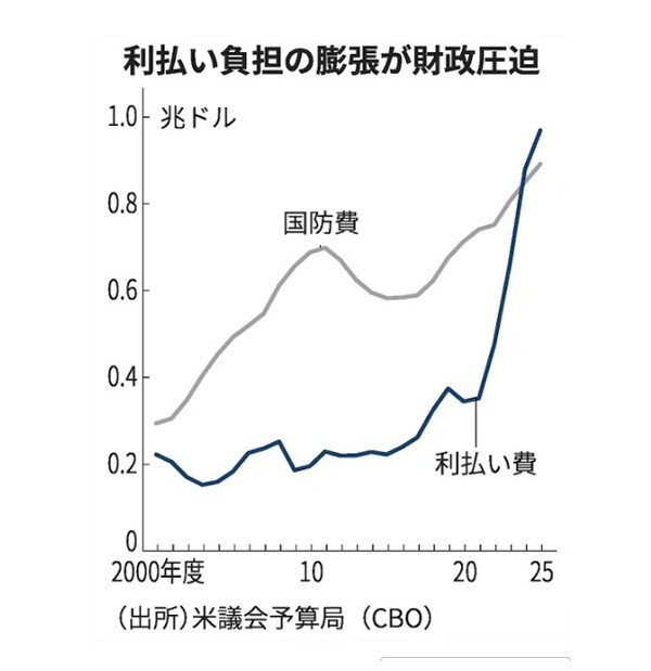 팽창하는 정부 부채 이자 지불로 압박을 받는 미국정부 재정. 2020년대 전반기에 이자 지불액(짙은 선)이 국방비(옅은 회색선)를 넘어섰다. 단위:조 달러, 자료 출처"미 의회예산국(CBO) 일본경제신문 3월 21일