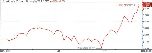 기준금리 인상 가능성이 고개를 들면서 통화정책에 민감한 2년 만기 미 국채 수익률도 이날 장중 3.9%대까지 오르며 금리 인상 기대감을 반영했다. 미국채 2년물 수익률이 전쟁 발발 직전 3.4% 수준이었던 점을 고려하면 약 3주 새 금리가 0.50%포인트 오른 셈이다. 미·이란 전쟁으로 고유가가 장기화하고 이에 따라 인플레이션이 따를 것이란 우려가 미국채는 물론 글로벌 채권 금리를 밀어 올렸다.