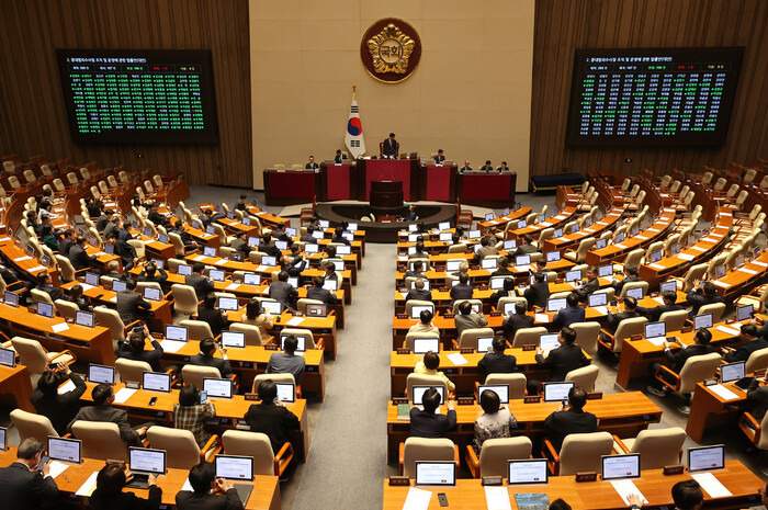 21일 국회 본회의에서 중대범죄수사청 조직 및 운영에 관한 법률안이 민주당 주도로 통과되고 있다. 연합