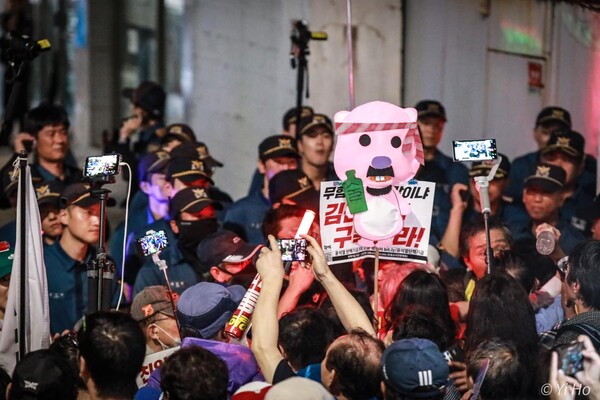 용산 대통령실을 향해 행진하던 104차 촛불대행진 참석자들을 경찰이 제지하고 있다. 이호 작가 사진.