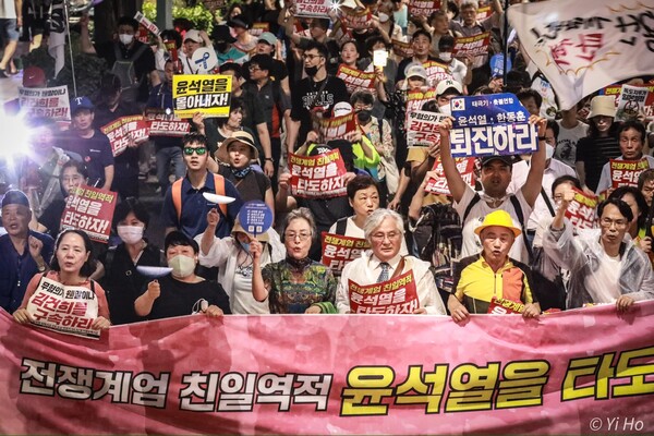 이날 촛불대행진의 주제는 ‘전쟁 계엄 친일 역적 윤석열 타도하자’였다. 시민들은 이 구호가 적힌 종이피켓을 들고 ‘윤석열 타도’를 외쳤다. 이날 시민들이 외친 구호에는 ‘전쟁조장 계엄음모’ ‘반국민세력 윤석열 일당’ ‘용산총독부 친일역적’ ‘독도 지우기 일본 밀정’ ‘국민에게 전쟁 선포’ 등 윤석열 정권이 최근 벌이고 있는 친일 행각에 대한 비난이 주를 이뤘다. 명품백을 받아챙긴 김건희 씨가 검찰로부터 무혐의 처분을 받았다는 소식에 ‘애완견 정치검찰 해체’ ‘김건희 구속’ 등을 외치기도 했다.