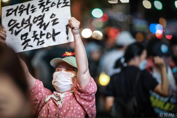 104차 촛불대행진 집회에서 한 찬석자가 '더위는 참아도 윤석열은 못참아'라고 쓰인 종이피켓을 높이 들고 있다. 이호 작가 사진