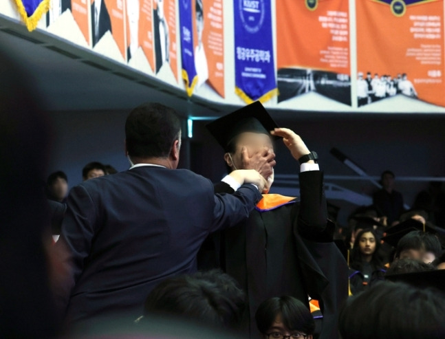 카이스트 졸업생인 신민기씨가 지난 2월16일 대전 카이스트에서 열린 2024년 학위수여식에서 윤석열 대통령에게 연구·개발(R&D) 예산 삭감과 관련해 항의하자 경호원이 그의 입을 틀어막으며 제지하고 있다. [연합]